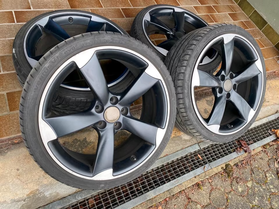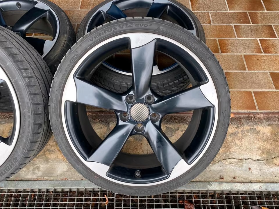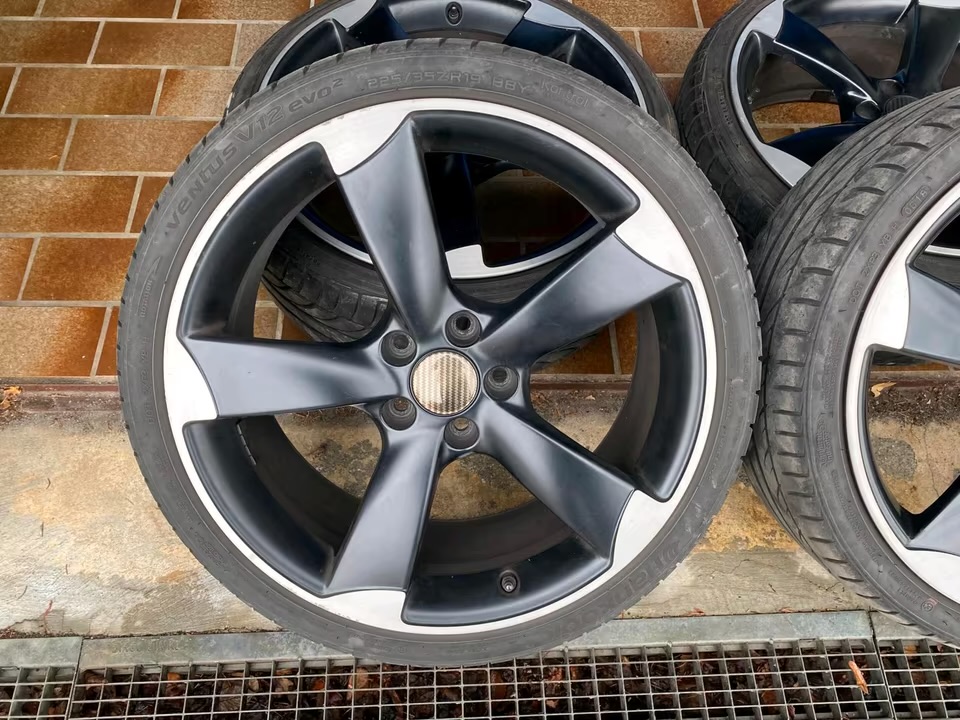 Original Audi Rotor ET50 8.5J 19-inch aluminum wheels, 5×112 bolt pattern, with 225/35/19 summer tires. The tires are worn and should be replaced; they have approximately 4 mm of tread depth. The rims have no cracks, and there are a few scratches, but nothing serious.
